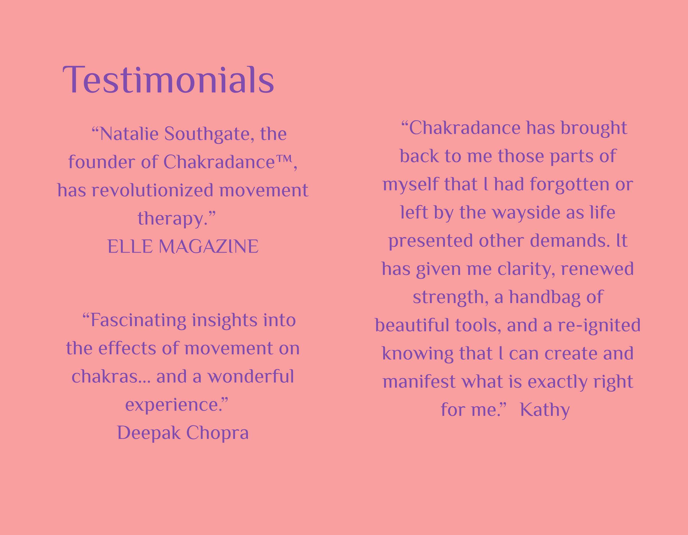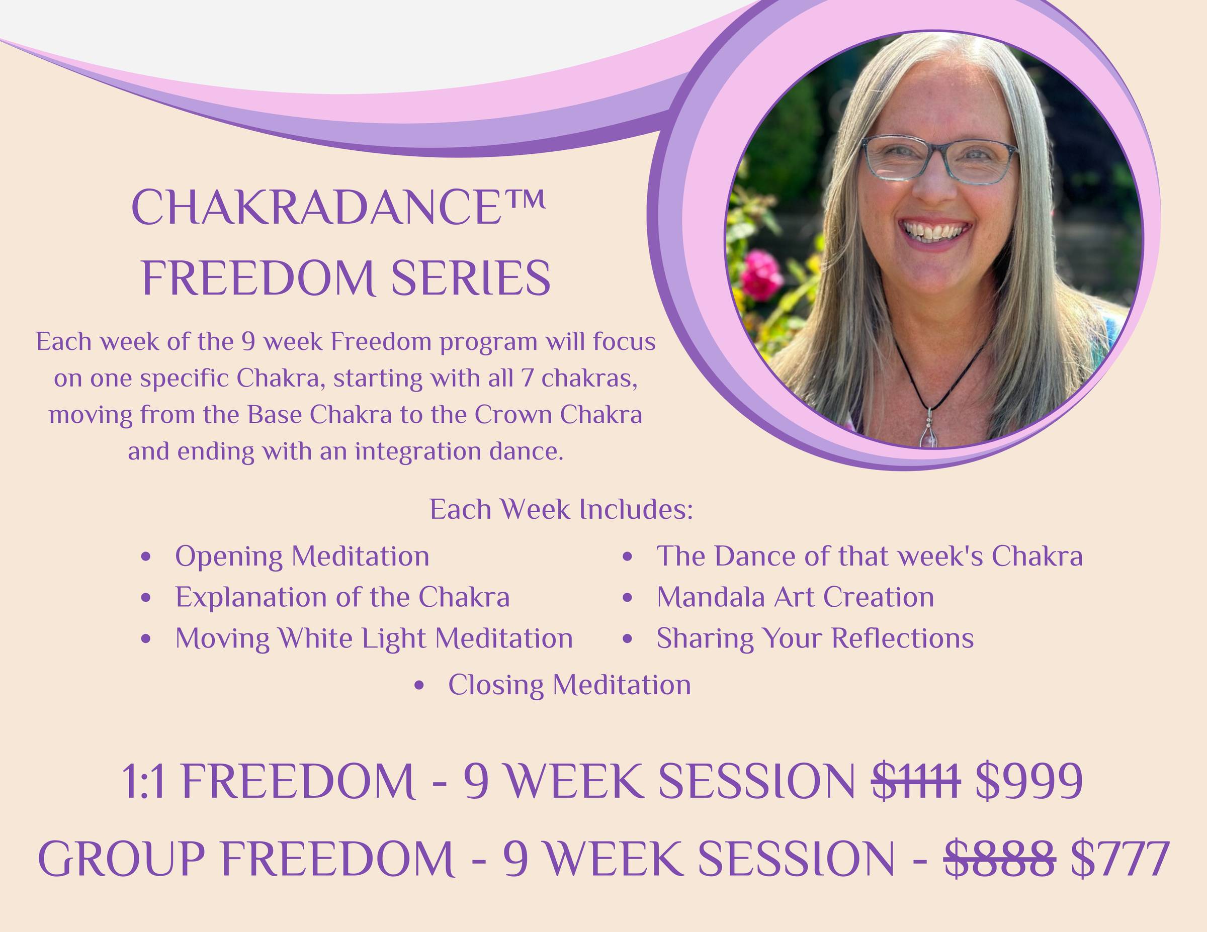 Chakradance™ Freedom is a 9-week transformational journey through the chakra system, from the base to the crown. Each weekly session includes: